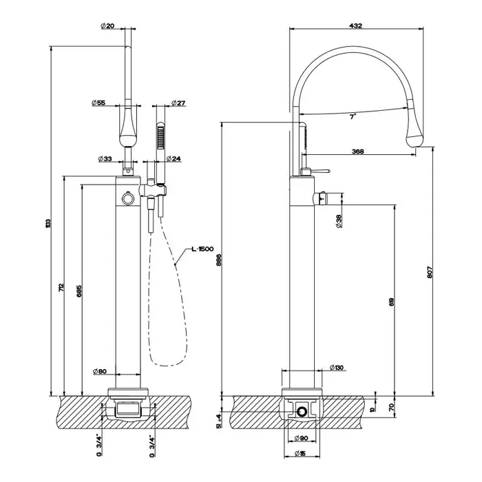 Gessi Goccia Напольный термостатический смеситель для ванны с ручным душем, внешняя часть, цвет: хром