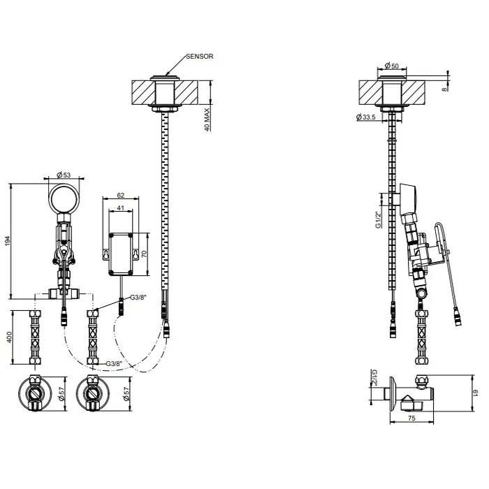 Gessi Inciso+ Смеситель для ванны на 4 отверстия для наполнения через слив-перелив, переключатель, шланг 1,50 м, цвет: black XL