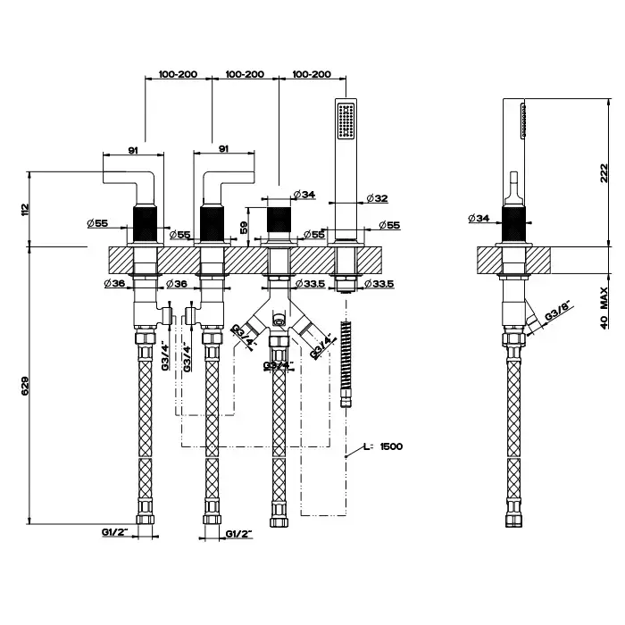 Gessi Inciso+ Смеситель для ванны на 4 отверстия для наполнения через слив-перелив, переключатель, шланг 1,50 м, цвет: black XL