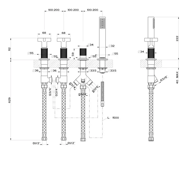 Gessi Inciso+ Смеситель для ванны на 4 отверстия для наполнения через слив-перелив, переключатель, шланг 1,50 м, цвет: black XL