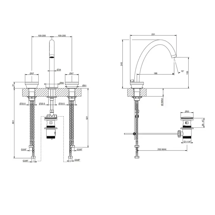 Gessi Origini Смеситель для раковины, 3 отверстия, донный клапан, высота излива 15 см, цвет: chrome 66013#031