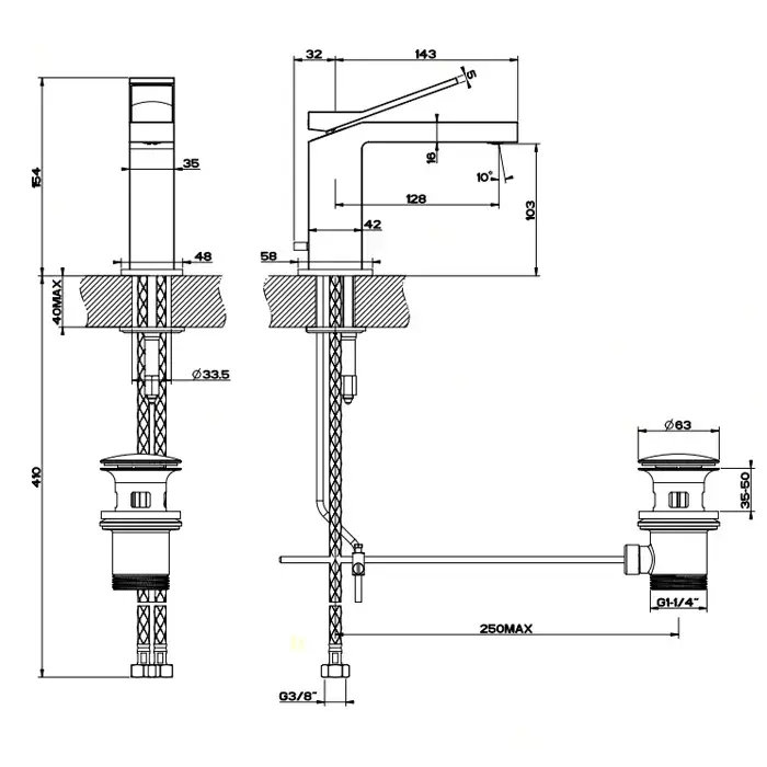 Gessi Rettangolo K Смеситель для раковины, встраиваемый, однорычажный, c подводом воды, держателем лейки и переключателем PULL, внешняя часть, цвет: Black XL