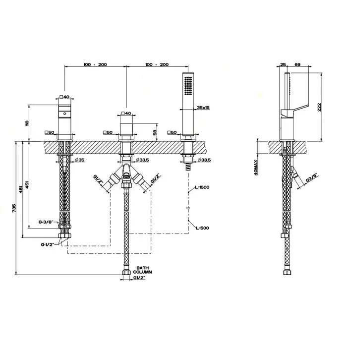 Gessi Rettangolo K Смеситель для ванны на 3 отверстия, с встроенным в излив переключателем и ручным душем, цвет: black XL