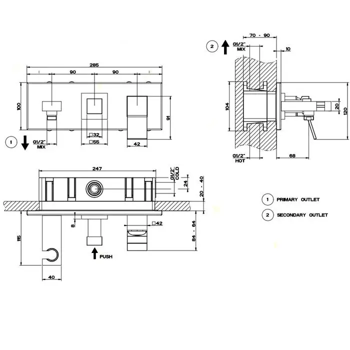Gessi Rettangolo K Встраиваемый смеситель однорычажный, подводом воды, держателем лейки и переключателем PUSH(внешние части), цвет: хром