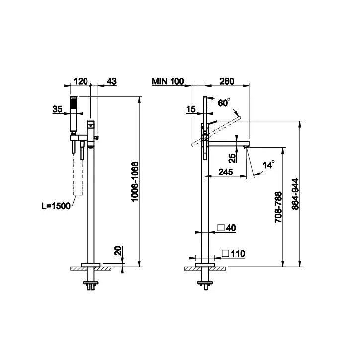 Gessi Rettangolo Смеситель для ванны напольный, с ручн. душем, внеш. ч., излив 26 см, цвет: chrome 53129#031
