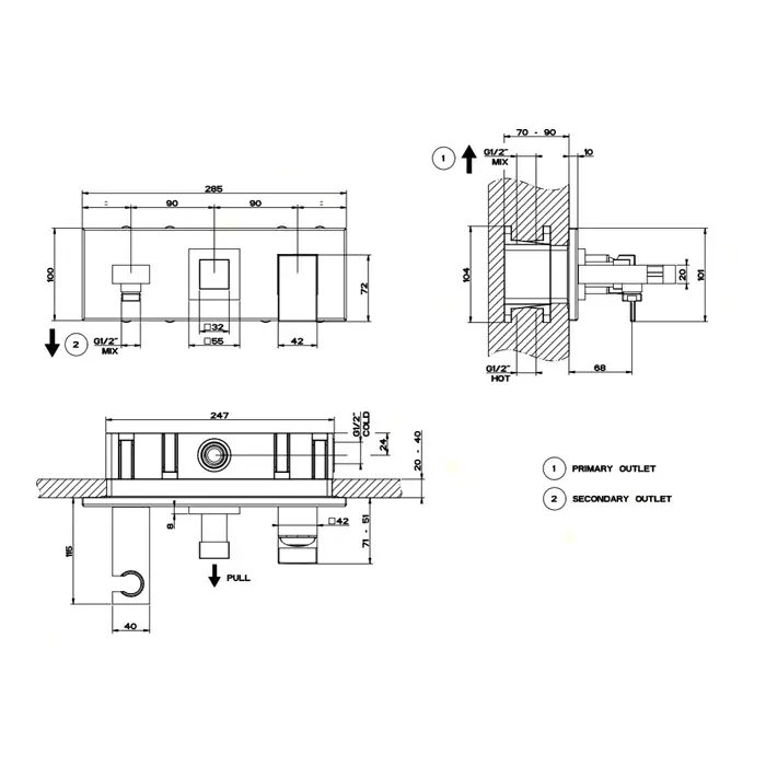 Gessi Rettangolo Смеситель для душа, встраиваемый, термостатический, подключение на 3/4", с 4мя независимыми выходами, внешняя часть, цвет: Black XL