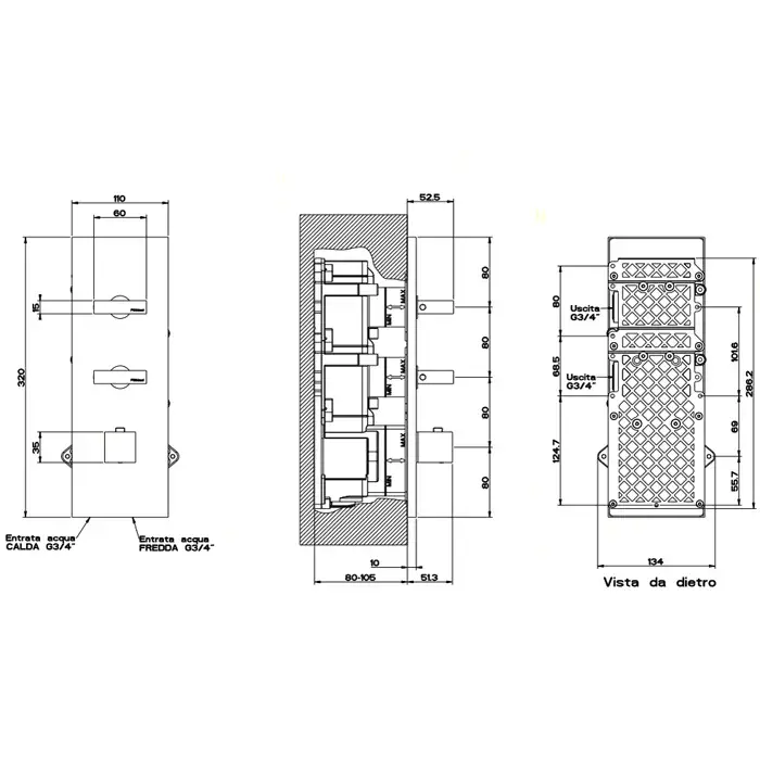Gessi Rettangolo Смеситель для душа, встраиваемый, термостатический, подключение на 3/4", с 4мя независимыми выходами, внешняя часть, цвет: Black XL