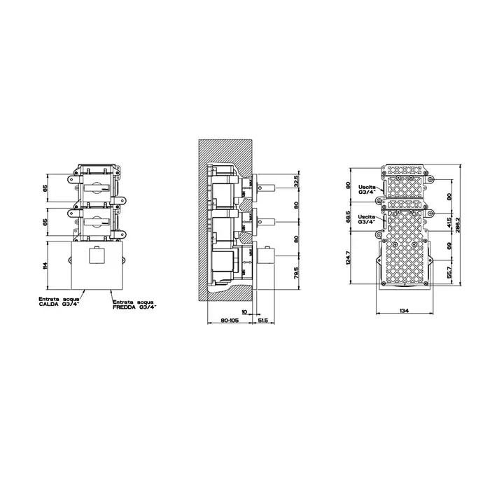 Gessi Rettangolo Смеситель для душа, встраиваемый, термостатический, подключение на 3/4", с 4мя независимыми выходами, внешняя часть, цвет: Black XL