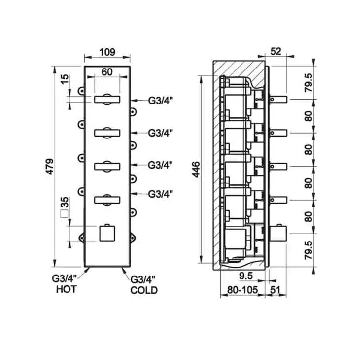 Gessi Rettangolo Смеситель для душа, встраиваемый, термостатический, подключение на 3/4", с 4мя независимыми выходами, внешняя часть, цвет: Black XL