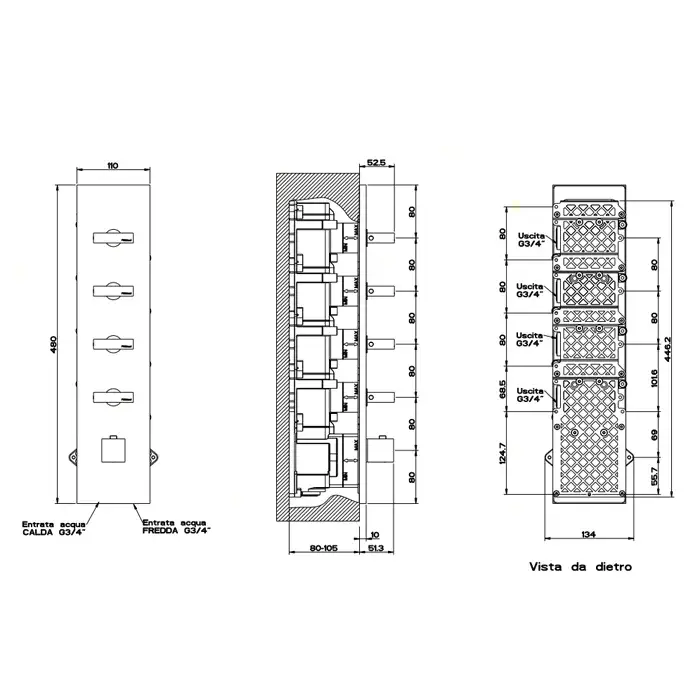 Gessi Rettangolo Смеситель для душа, встраиваемый, термостатический, подключение на 3/4", с 4мя независимыми выходами, внешняя часть, цвет: Black XL