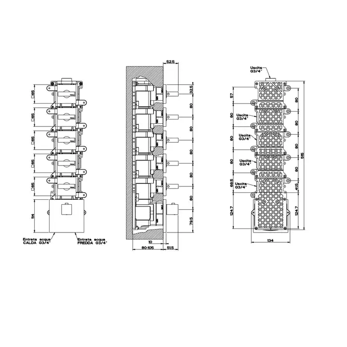 Gessi Rettangolo Смеситель для душа, встраиваемый, термостатический, подключение на 3/4", с 4мя независимыми выходами, внешняя часть, цвет: Black XL