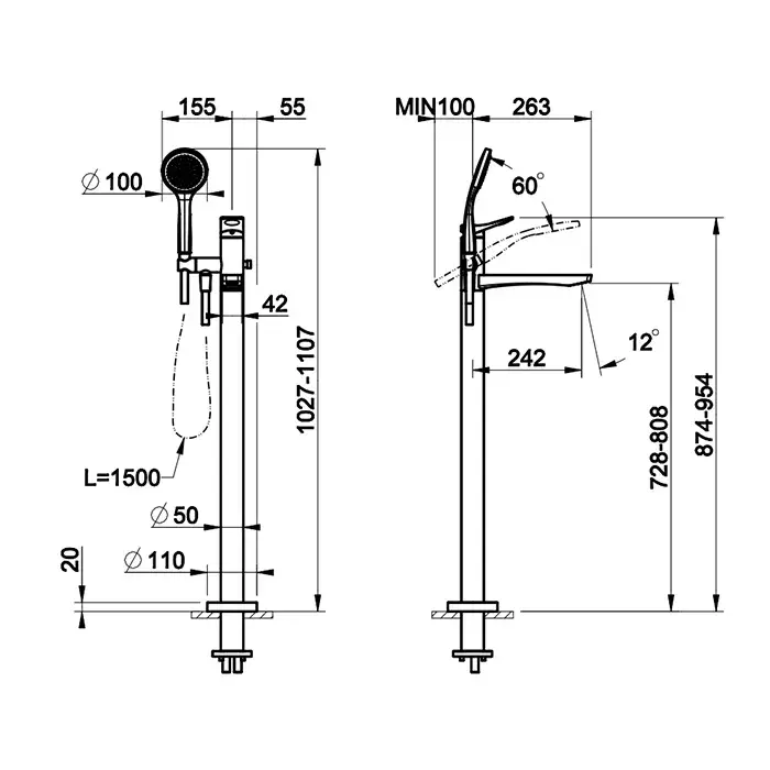 Gessi Rilievo Смеситель для ванны, напольный, с душевой лейкой, цвет: Matte White 59131#279