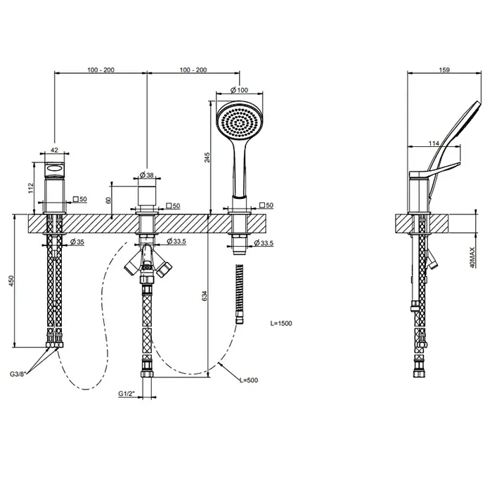Gessi Rilievo Смеситель на борт ванны на 3 отв, без излива, с ручн. душем, цвет: matte black 59043#299