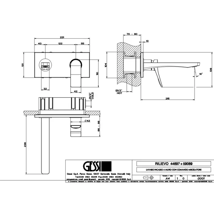 Gessi Rilievo Встраиваемый смеситель для раковины с изливом 21,5 cм, цвет хром 59089#031