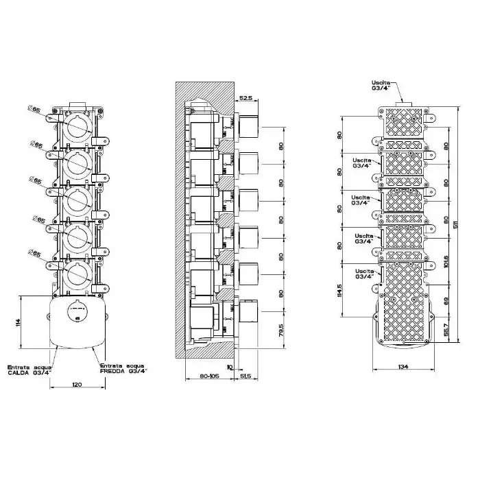 Gessi Tondo Встраиваемый термостат для душа, с 5ю независимыми выходами, верт/гориз установка, внешняя часть, цвет: хром