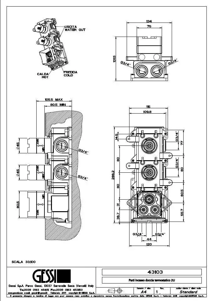 Gessi Внутренняя часть встр. смес. термостат. с 2мя независимыми выходами 43103#031
