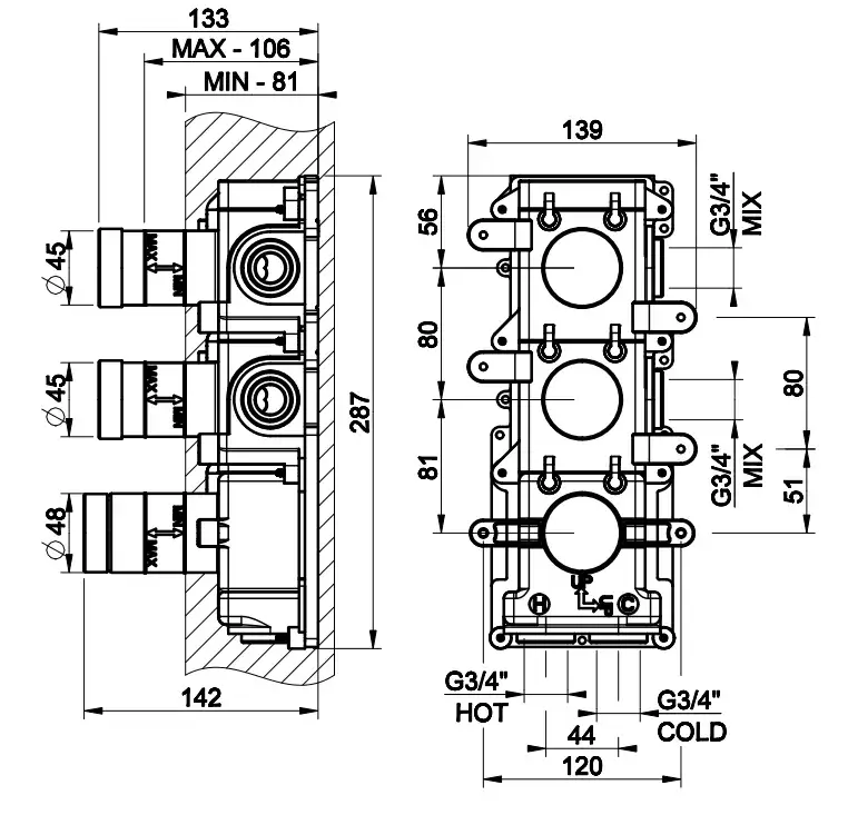 Gessi Встраиваемая часть для термостата на 2 независимых потребителя, цвет: chrome 09264#031