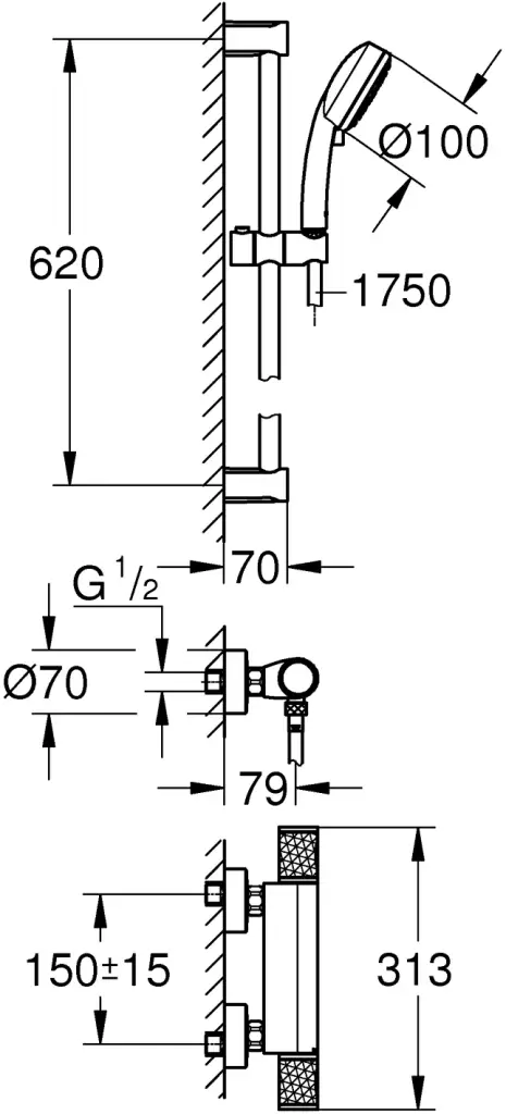 Grohe Grohtherm 1000 Performance Душевой комплект, лейка 10 см, шланг 175 см, цвет: хром 34783000