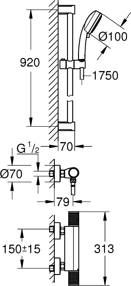 Grohe Grohtherm 1000 Performance Душевой комплект, лейка 10 см, шланг 175 см, цвет: хром 34783000