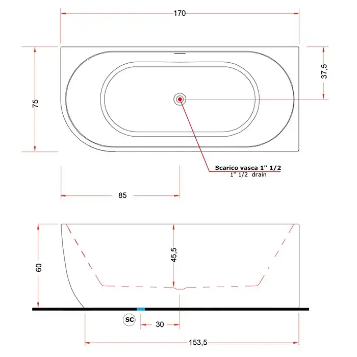 Gruppo Treesse Cora Ванна пристенная 170x75см, SX, акриловая, цвет: белый матовый