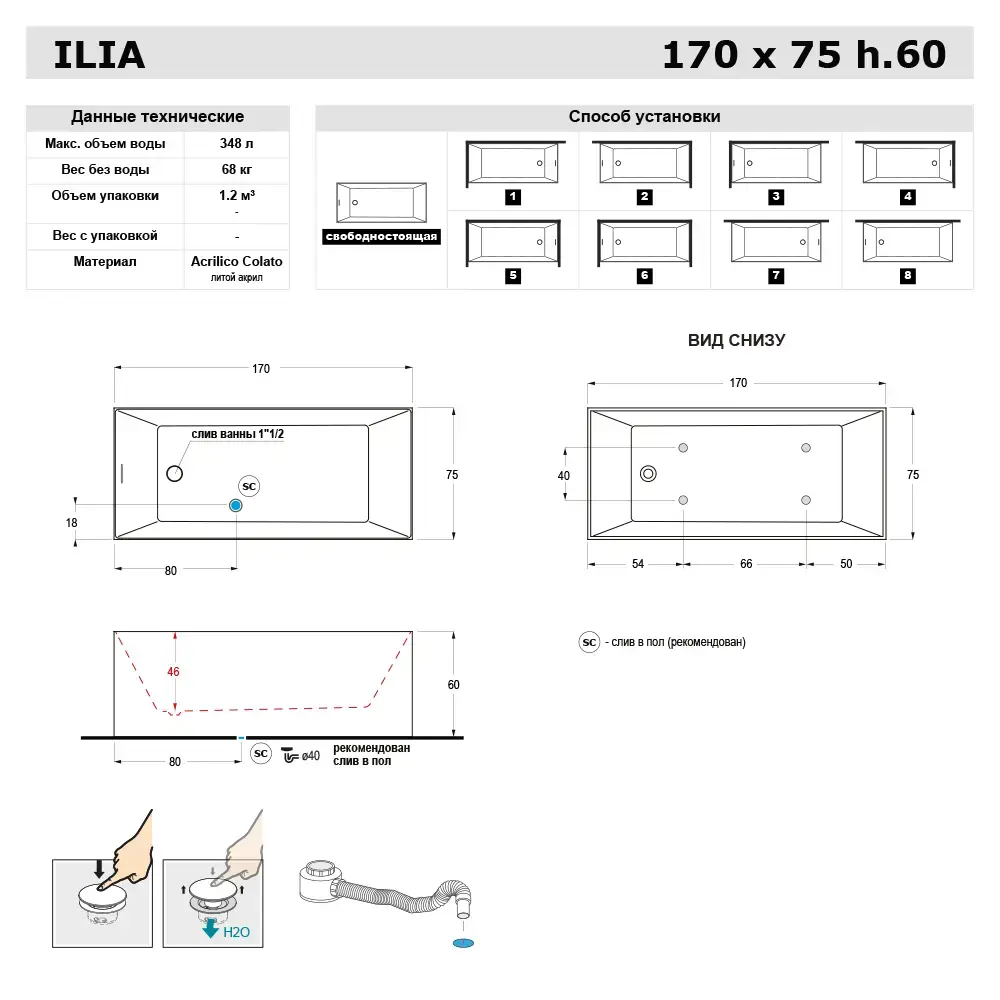 Gruppo Treesse Ilia Ванна 170x75x60 см, прямоугольная, отдельностоящая, акриловая, со щелевым переливом, цвет: белый матовый