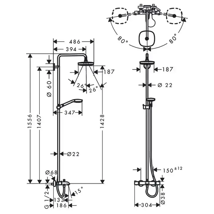 HG Croma Select S Душевая система Showerpipe: верх.душ 180 2jet, ручн.душ, шланг, термостат для ванны, излив 186мм, цвет: белый/хром