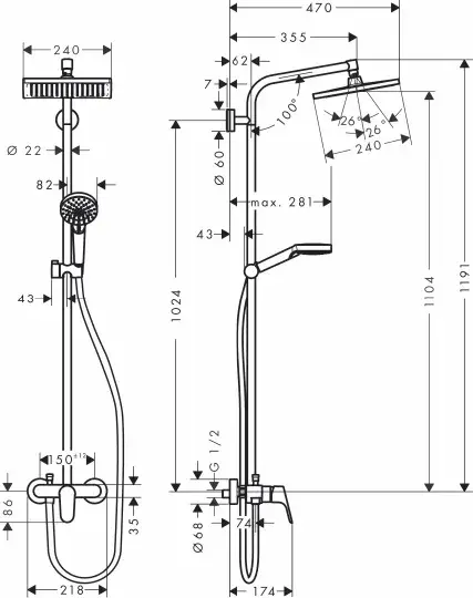 Hansgrohe Crometta E Душевая стойка: смеситель, верхний душ 24x24 см, ручной душ, цвет: хром 27284000