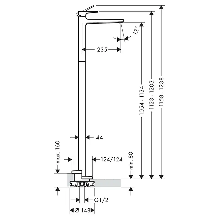 HG Metropol Смеситель для раковины напольный, на 1 отв, без донного клапана, излив 235мм, h1134мм, цвет: хром