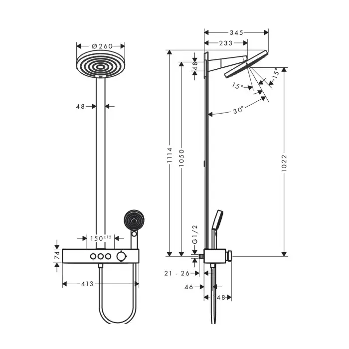 HANSGROHE PULSIFY Душевая стойка с термостатическим смесителем, верхним душем Ø260 мм с 2 режимами, ручным душем и шлангом, цвет белый матовый