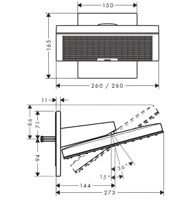 Hansgrohe Pulsify E Верхний душ 26х26 см, 2 вида струи, кронштейн настенный, цвет: хром глянцевый 24350000