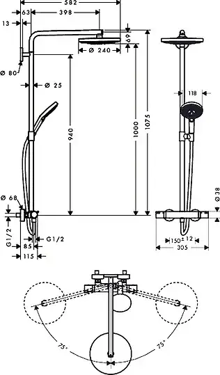 Hansgrohe Raindance Select S Душевая стойка:термостат,верхний душ 24 см,ручной душ, цвет: хром/белый 27129400