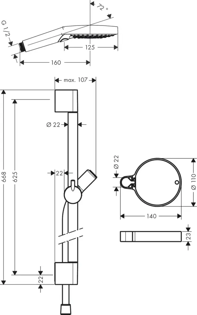 Hansgrohe Raindance Select S Душевой набор: штанга 65см., ручной душ 120, 3jet (Rain, RainAir, WhirlAir), мыльница, шланг, цвет: белый/хром