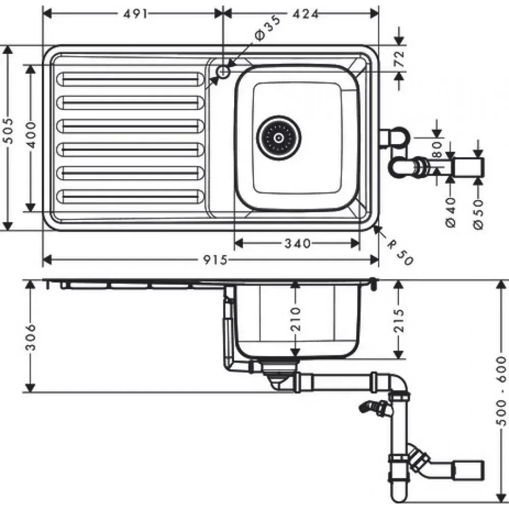 Hansgrohe S41 Кухонная мойка встраиваемая сверху 1 чаша, слив 91,5x50,5 см, цвет: нержавеющая сталь 43340800