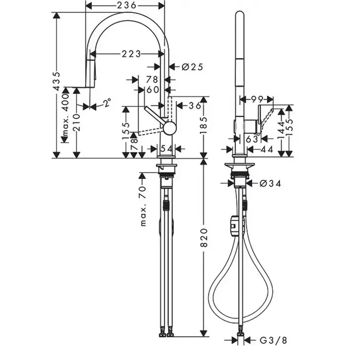 HG Talis M54 Смеситель для кухни, на 1 отв, однорычажный, поворотный излив 223мм с вытяжным душем, 2jet, h210мм, sBox, цвет: хром