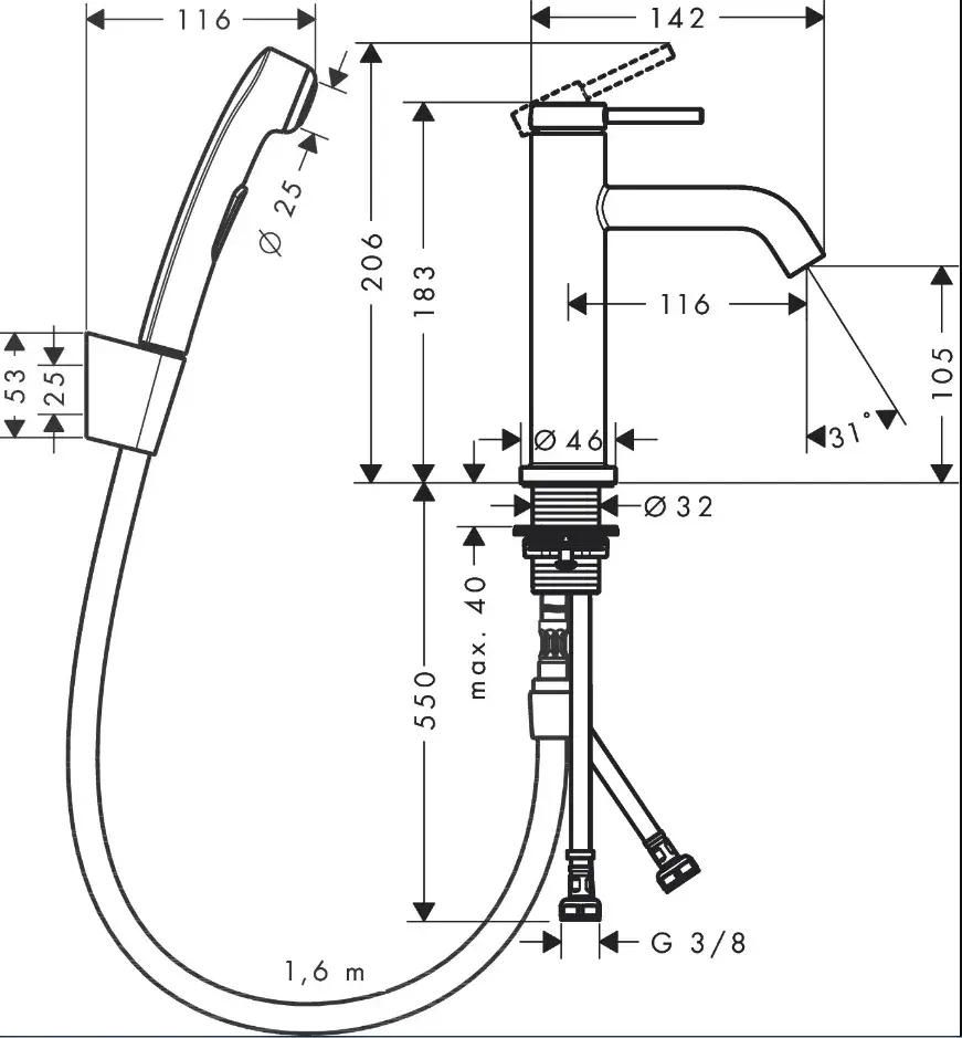 Hansgrohe Tecturis S Смеситель для раковины однорычажный с гигиеническим душем, цвет: матовый черный 73211670