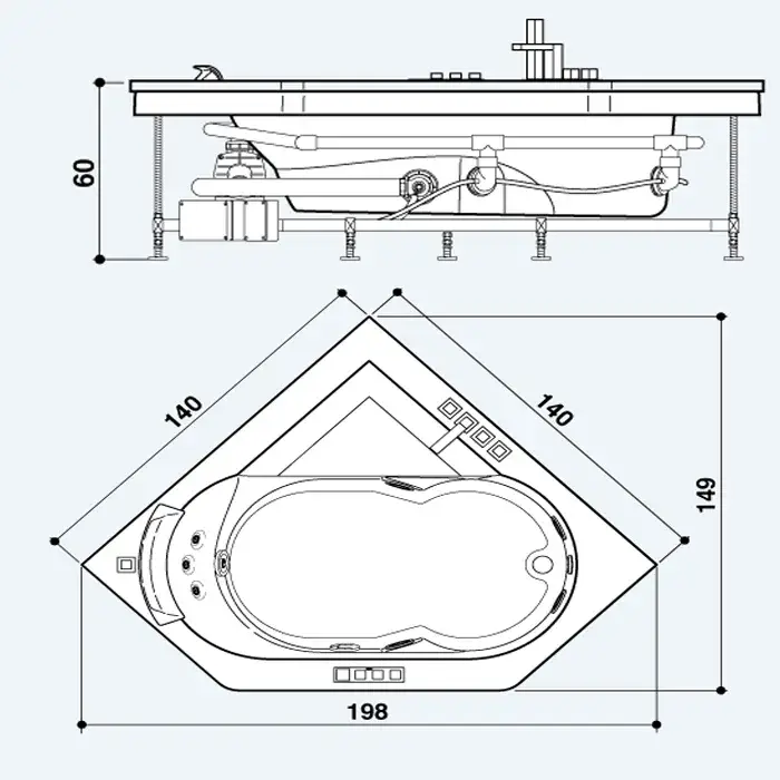 Jacuzzi Aura Corner 140 Ванна 144x144xh60 см, смеситель Aura, топ - тик 9F43-495A