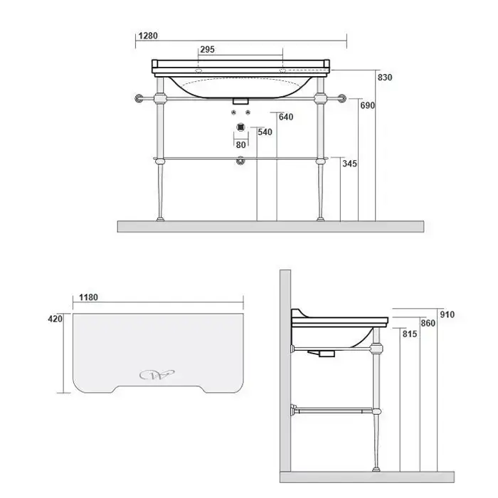 Kerasan Waldorf Металлическая структура для раковины 120см, со стеклянной полочкой, цвет золото (из 2-х коробок: арт. 920391+920291 и 920401)