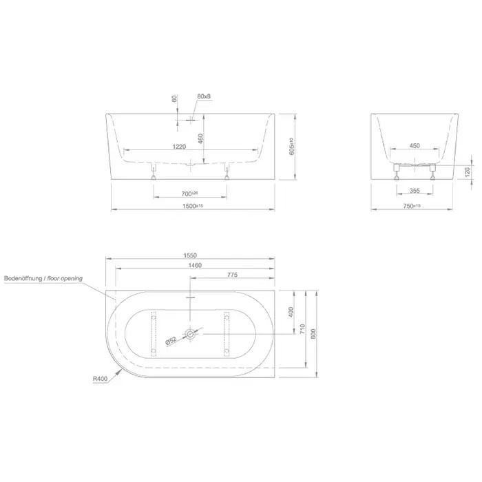 Knief Fresh XS Ванна отдельностоящая 155х80х60см.,слив щелевой, без слив-перелива, цвет: белый глянцевый