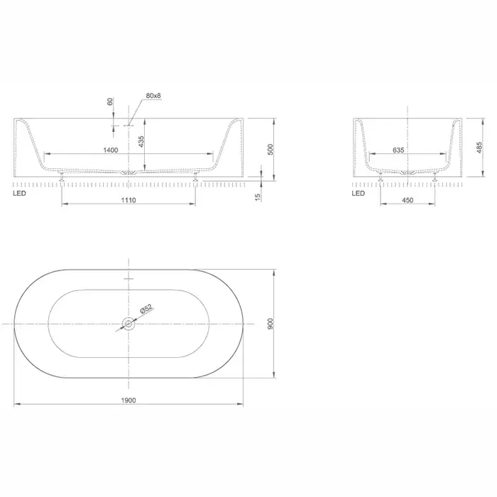 KNIEF Moon Ванна отдельностоящая 190x90x50см, c встроенной LED подсветкой ,с слив переливом , цвет: белый матовый