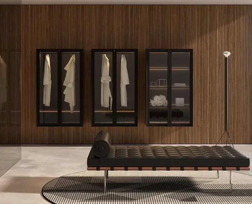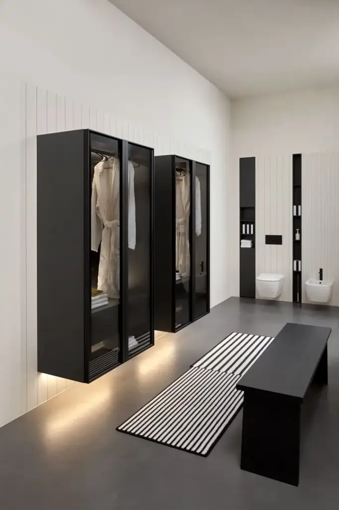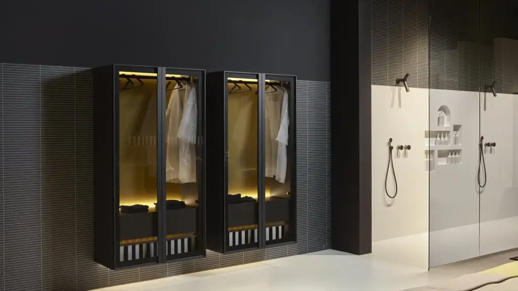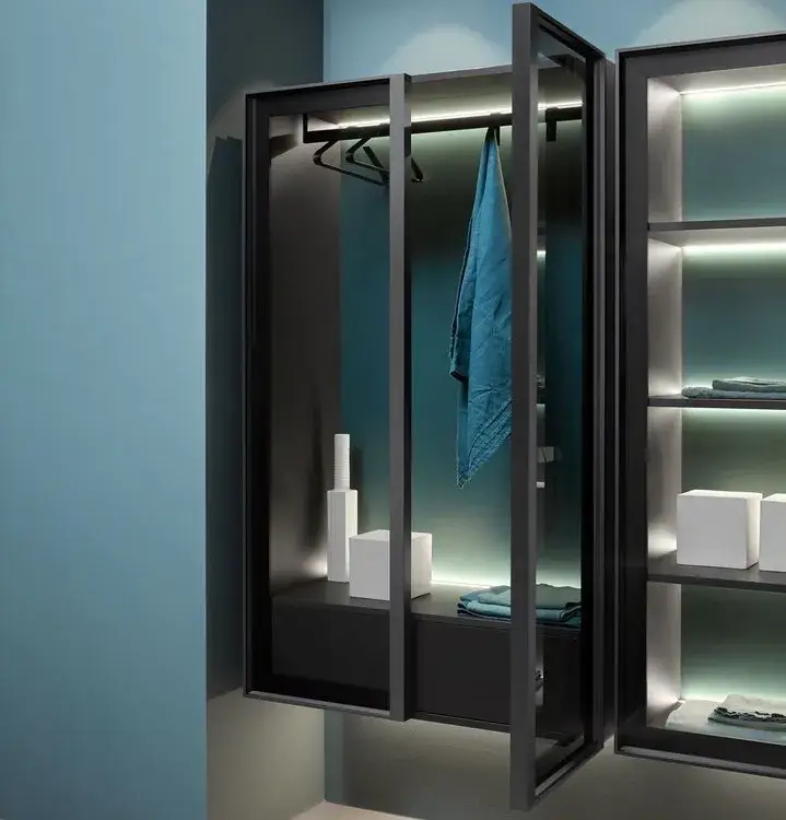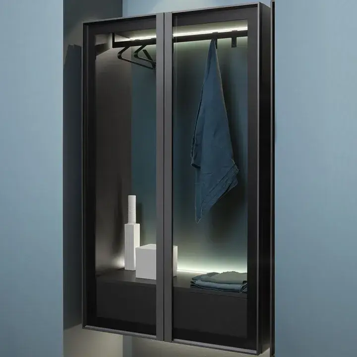 Колонна-гардероб, с внутренней LED подсветкой 90*47*175h корпус skin cenere/рама nero opaco/стекло transperente fume/задн.панель coccodrilo lucido