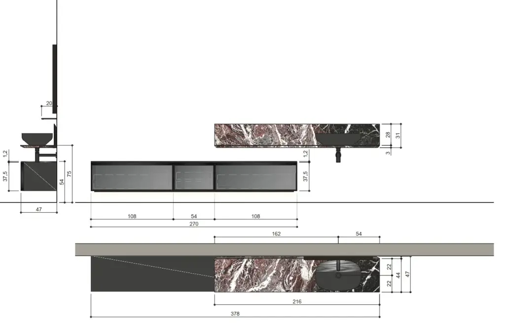 Комплект мебели с раковиной Antonio Lupi BEMADE DIBM2108.2.5+LED_IN+DF1.DX+DIBM254.2.5+LED_IN+DIBM2108.2.5+LED_IN+DF1.SX+ITM21.270+AGO60+SHELF+BARRALED.261+SRC40108*2+SRC4054+SRI4054+SRV4022*2+SLIM40.54 BASALTO SETA/рама-NERO OPACO/стекло-ACIDATO FUME/мрамор ROSSO LEVANTO/раковина COLORMOOD BASALTO