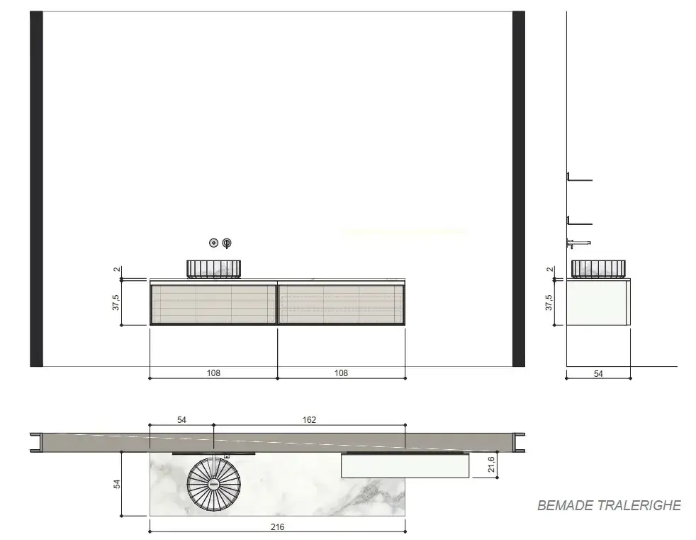 Комплект мебели с раковиной Antonio Lupi BEMADE TRALERIGHE+LED_IN+DF1.SX+BEMADE TRALERIGHE+LED_IN+DF1.DX+FONTE+MR154.216+SRI54108+SRC54108*2+SRV5422+BARRALED.207+SLIM54.108 BIANCO SETA/фронт-стекло-RO630N/раковина BIANCO CARRARA/топ BIANCO CARRARA
