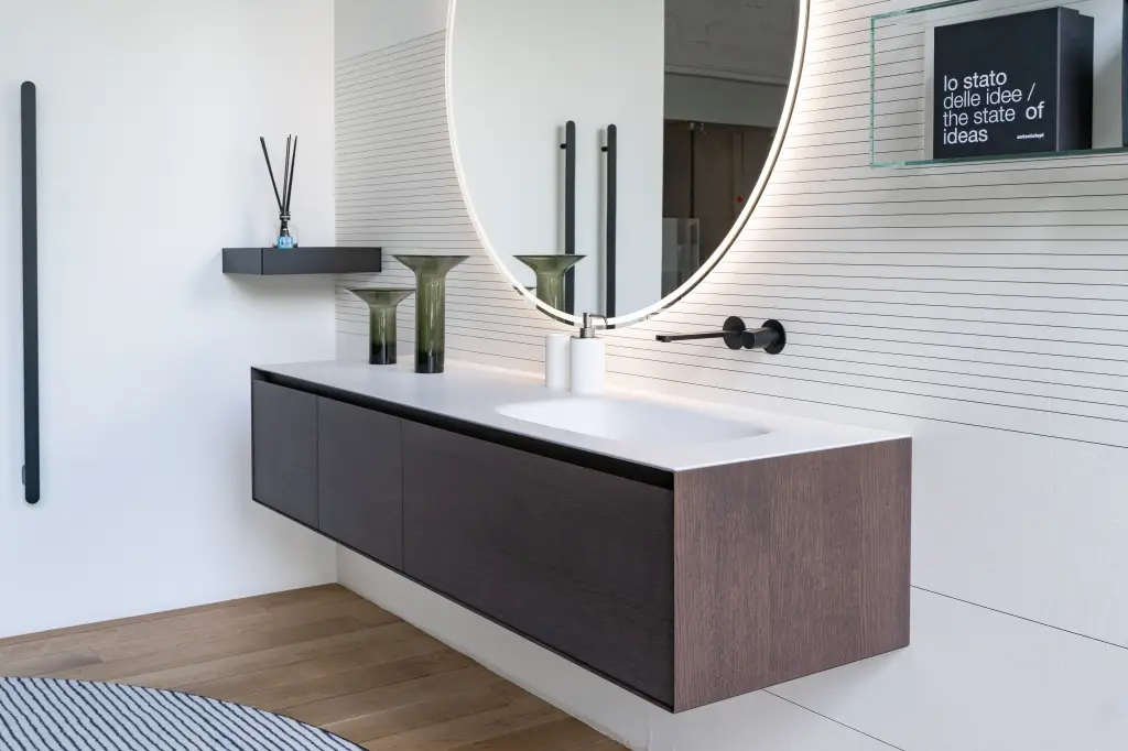 Тумба для ванной комнаты Antonio Lupi Panta Rei PI4180_D + PB4180_D + PZ54 180 + TARSIA147 188 + T47*5 + URNAMOOD satin grigio smog/satin bianco/Rovere thermo