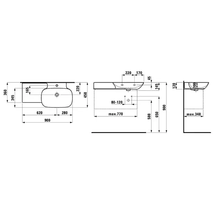Laufen Ino Раковина 90х45хh12 см, без отв. под смеситель, полка слева, цвет белый 8.1330.1.000.109.1