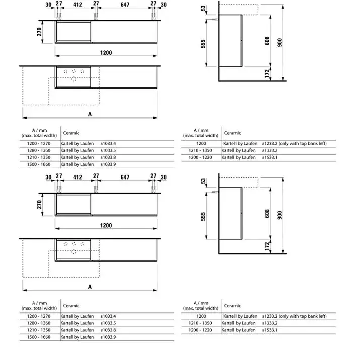 Laufen Kartell Тумба под раковину справа, 120х27х61см, с 1 дверцей и 2 створками, подвесная, покрытие LLC, цвет: белый матовый