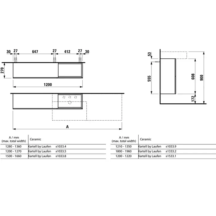Laufen Kartell Тумба под раковину справа, 120х27х61см, с 1 дверцей и 2 створками, подвесная, покрытие LLC, цвет: белый матовый