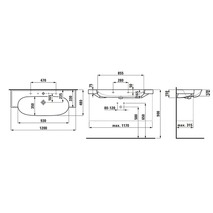 Laufen New Classic Раковина 120х48хh7,5 см, с 3 отв., под смеситель, цвет: белый 8.1385.8.000.108.1
