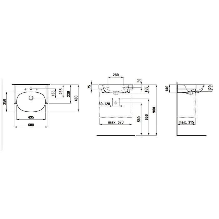 Laufen New Classic Раковина 60х48хh7,5 см, с 3 отв., под смес., цвет: белый мат. 8.1385.3.757.108.1