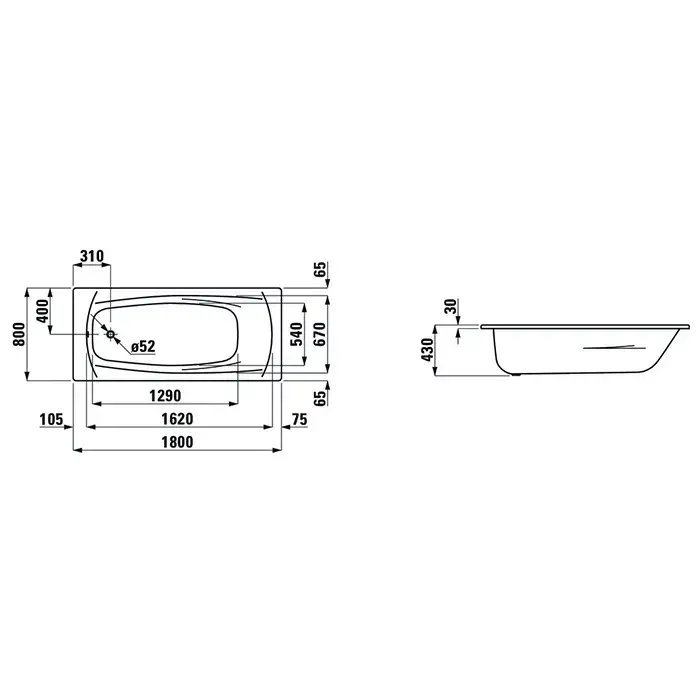 Laufen Palladium Ванна встраиваемая, 180x80см., эмалированная сталь (3.5 мм), шумоизоляционное покрытие, без отверстий для ручек, с антискользящим покрытием, цвет: белый