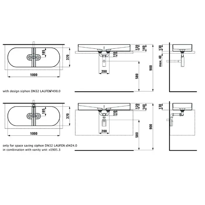 Laufen Sonar Раковина двойная 100x37хh13 см, цвет белый 8.1234.8.000.112.1
